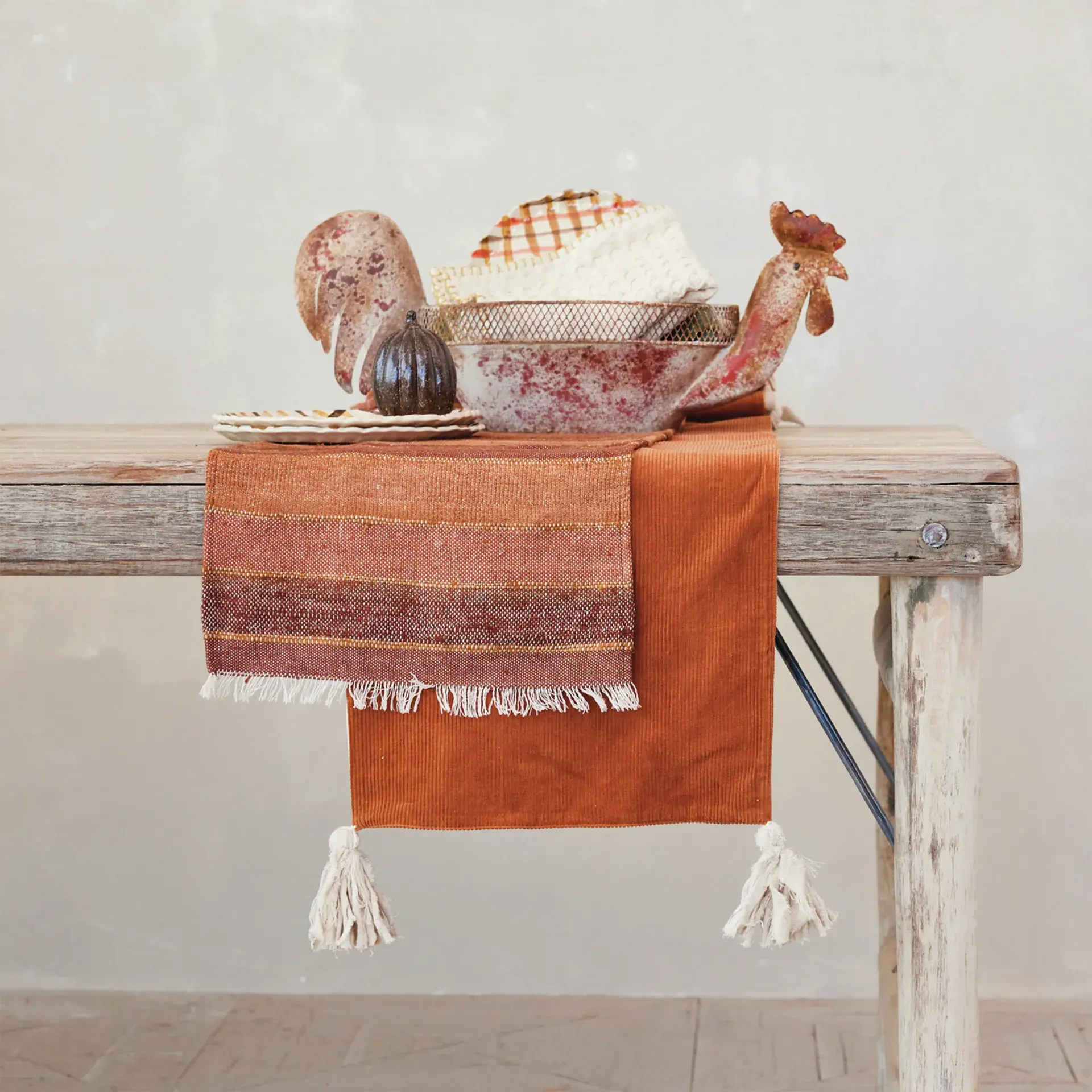 Contenedor decorativo de metal con forma de gallo, acabado muy desgastado, color óxido (cada unidad varía).