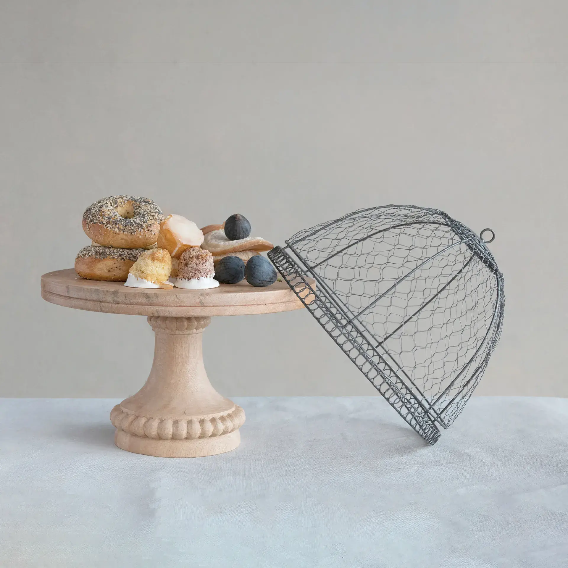 Campana de alambre de metal redonda con asa y base de pedestal de madera, acabado en zinc, natural, juego de 2